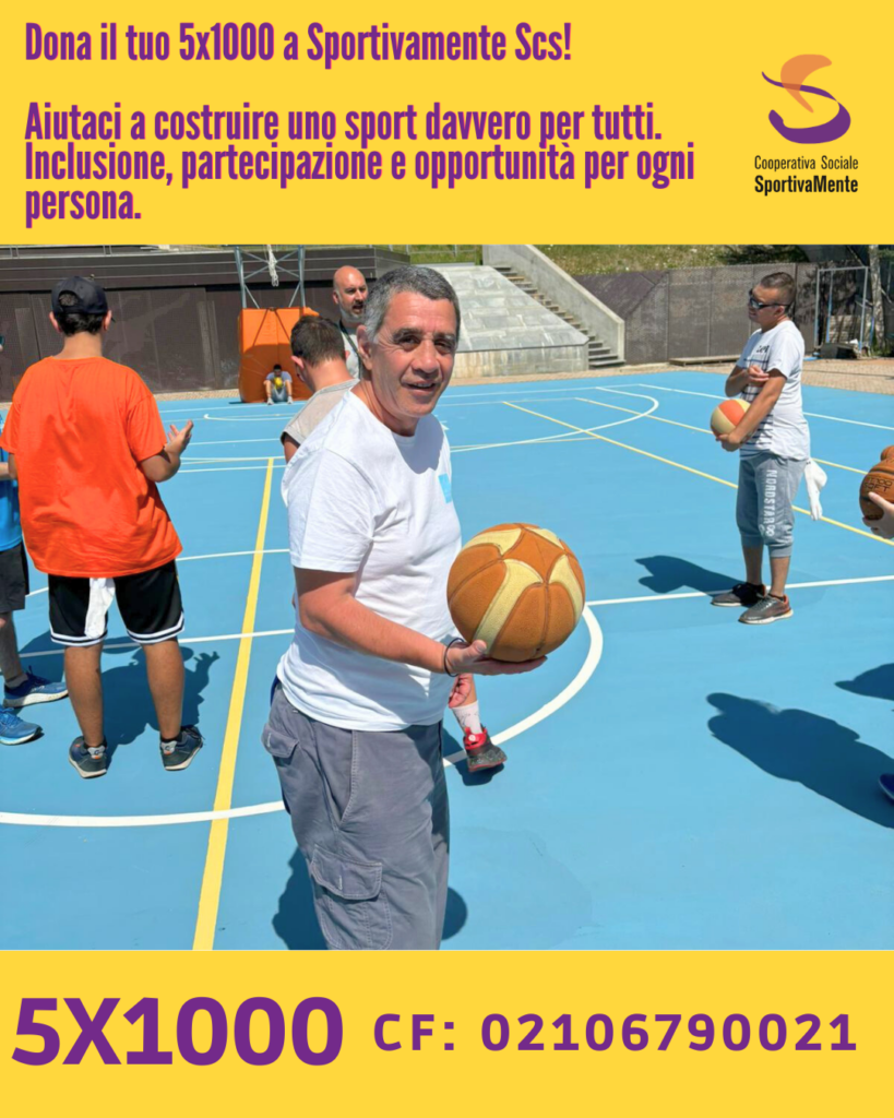 Destina il tuo 5×1000 a Sportivamente cooperativa sociale e ci aiuterai a sostenere progetti sportivi di Inclusione dedicati a persone con disabilità intellettiva.